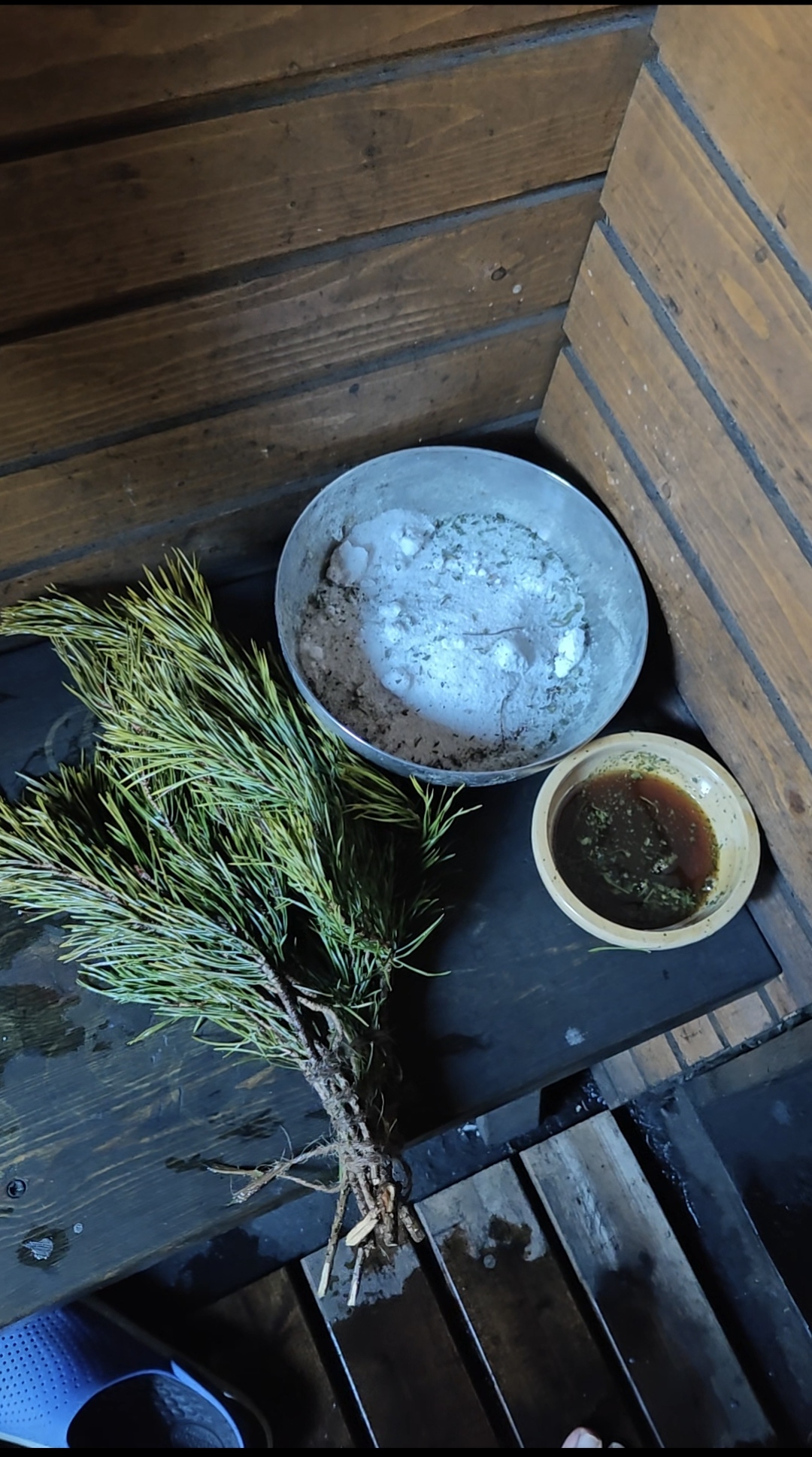 Tasaisin väliajoin käymme joukolla ulkona viilentymässä tai pulahtamassa kylmäpaljuun. Tauoilla ei malttaisi sanoa sanaakaan, rikkoa hiljaisuuden lumoa. Sisään palattaessa Kuorimme ihomme karkealla suolalla. Suola säilöö, mutta myös puhdistaa, ja siltä sen vaikutus tuntuukin. ”Miettikää, mitä tahdotte jättää taaksenne, näihin löylyihin”, saunottaja opastaa. Asioita nousee kuin itsestään mieleen useampikin.