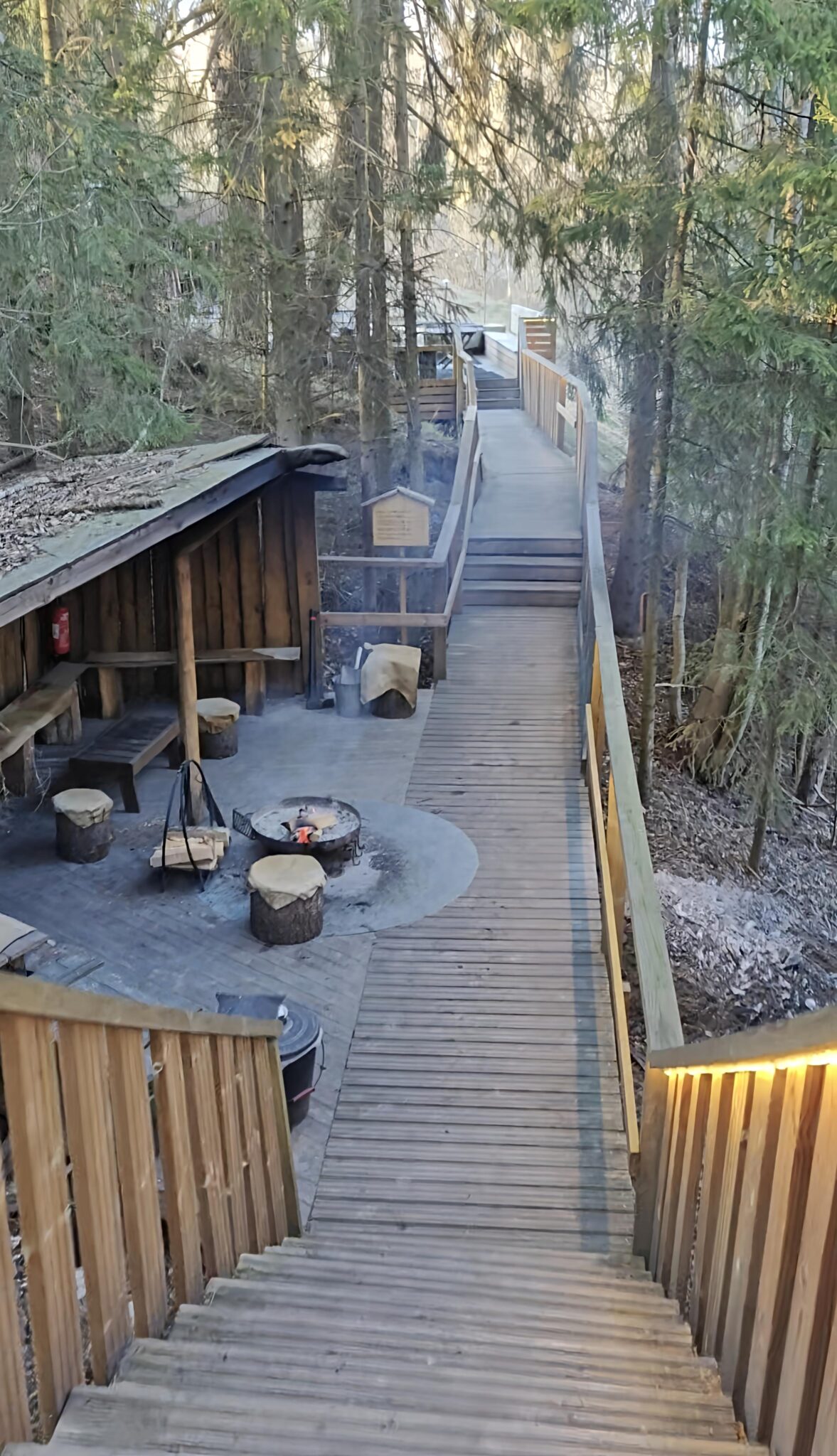 Saunalle kuljetaan pitkospuita muistuttavaa, puiden reunustamaa siltarakennelmaa pitkin