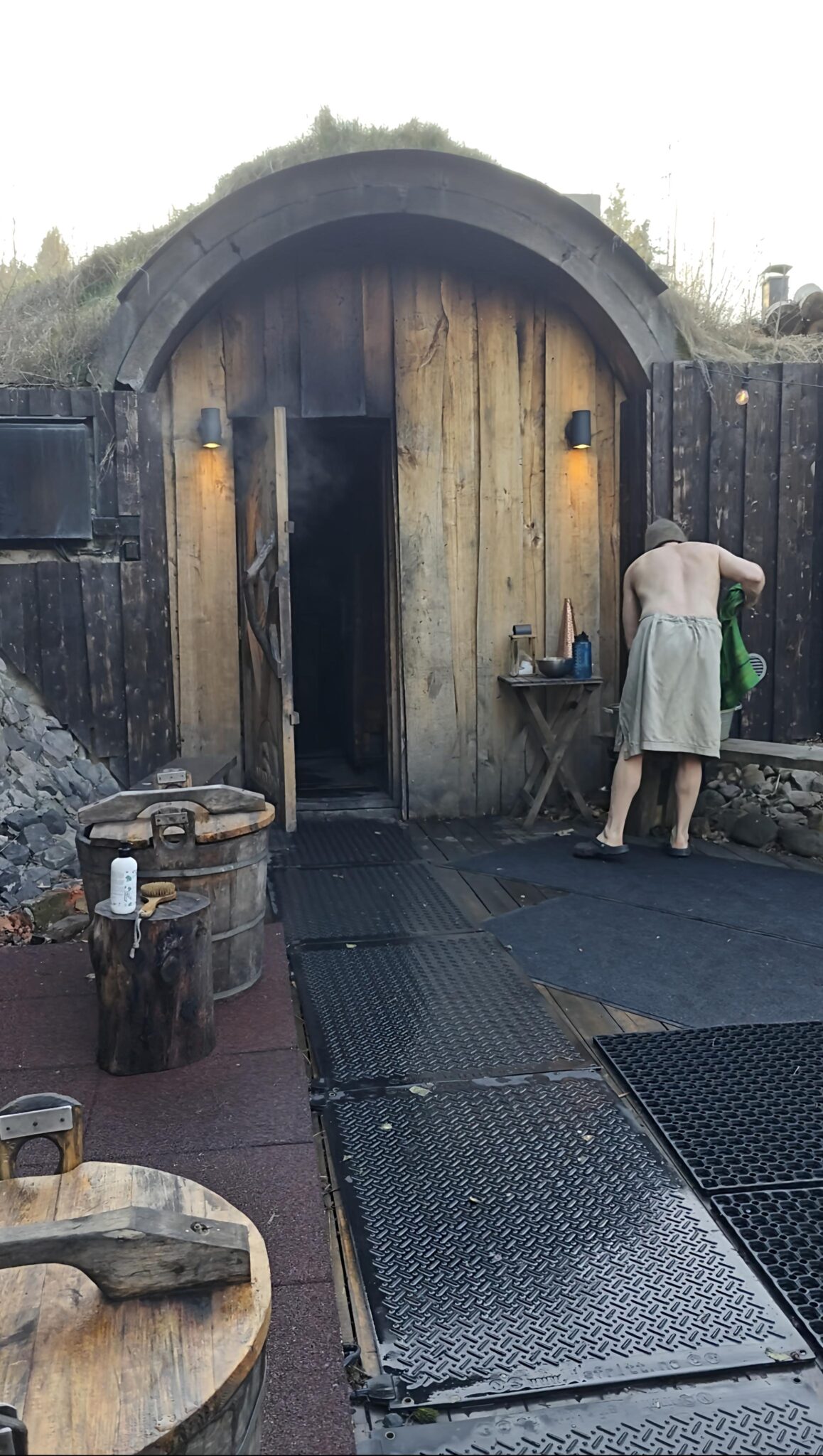 Kävelemme leveitä, puiden reunustamia siltamaisia pitkospuita. Ohitamme kodan ja lempeästi loimattavan nuotion. On huhtikuu ja kevät on jo valoa täynnä. Lintujen ponteva laulu ja odottavan jännittynyt puheenpulputus säestävät askelten kopsetta. Sitten eteemme avautuu kaarikattoinen, nurmen kätkemä rakennus, jonka jykevän puisessa ovessa on kauniita kaiverruksia, sekä aukea tila höryävine kuumavesikattiloineen, pesusoikkoineen ja paljuineen. Pienet yksityiskohdat vangitsevat katseen: tuolla on saunahattu, tuolla selänpesuharja, kulhollinen karkeaa suolaa, eri puulajeista sidottuja vihtoja, lisää kauniita kaiverruksia. Olemme saapuneet syntymäpäivilleni: perinnesaunotukseen Sipoonjoen perinnesaunalle.