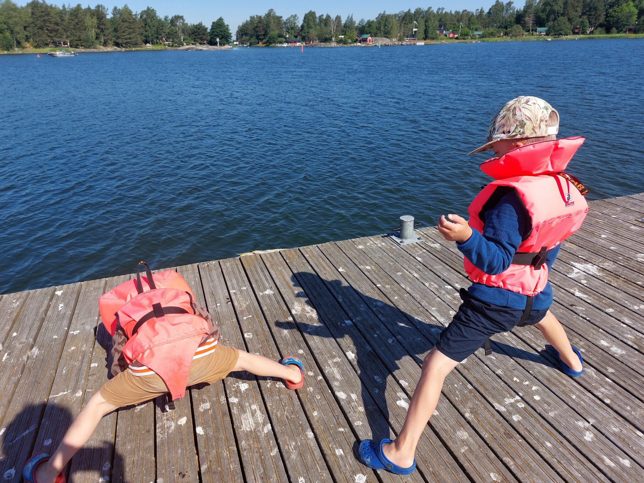 Tänä kesänä jokin muuttui. Meillä on mieheni kanssa mökeillä ollessamme tapana aloittaa aamut aina aamu-uinnilla. Katseltuamme uintejamme pari viikkoa, lapset yllättäen ilmoittivat tulevansa mukaan. Ensimmäisillä kerroilla uiminen tarkoitti lähinnä jalkojen kastelua, kunnes erään kerran molemmat uskaltautuivat laiturilta (kovan huudon saattelemina) kokonaan veteen. Onnistumista seurasi niin suuri riemu, että kastautuminen piti toistaa moneen kertaan.