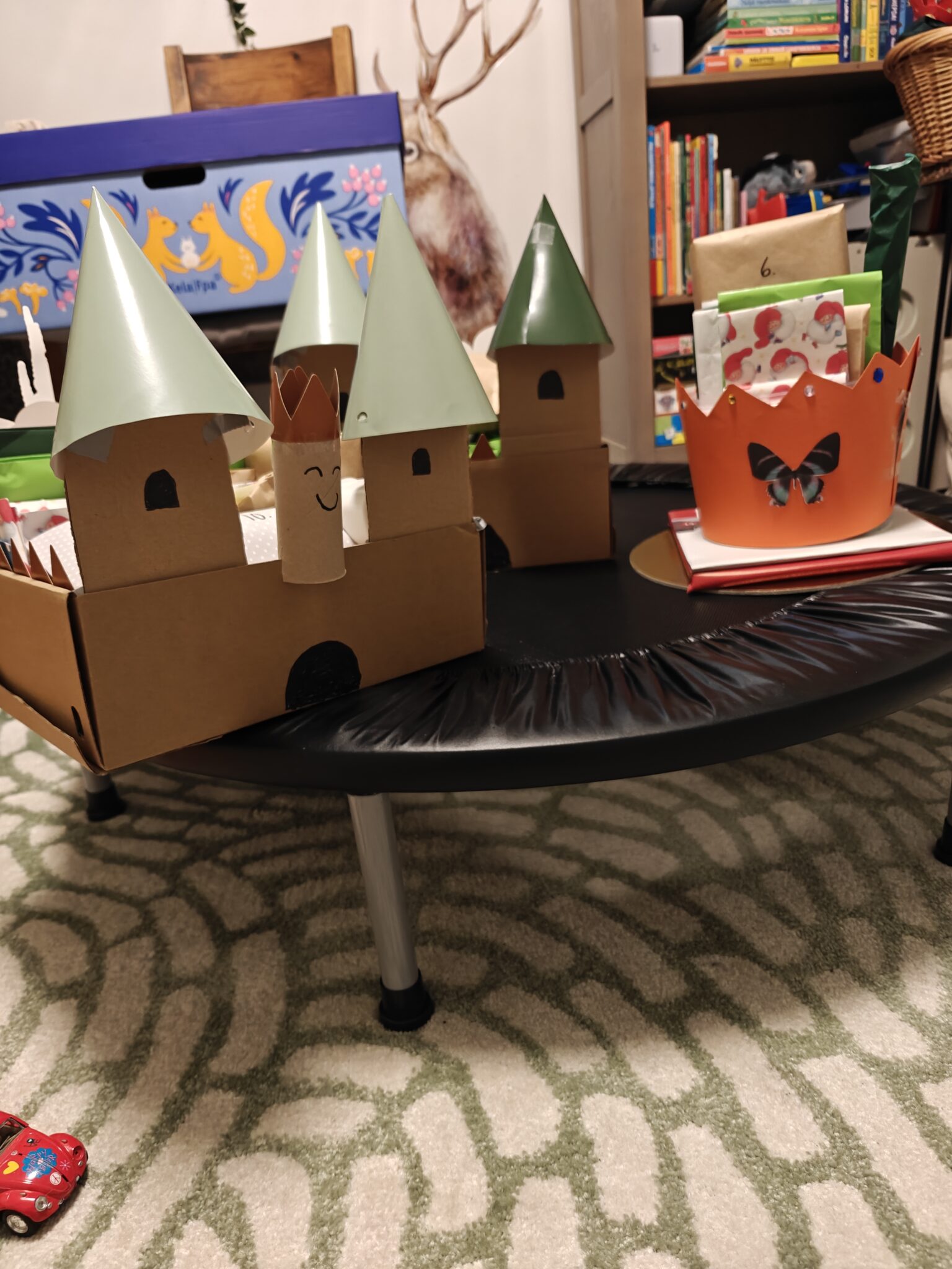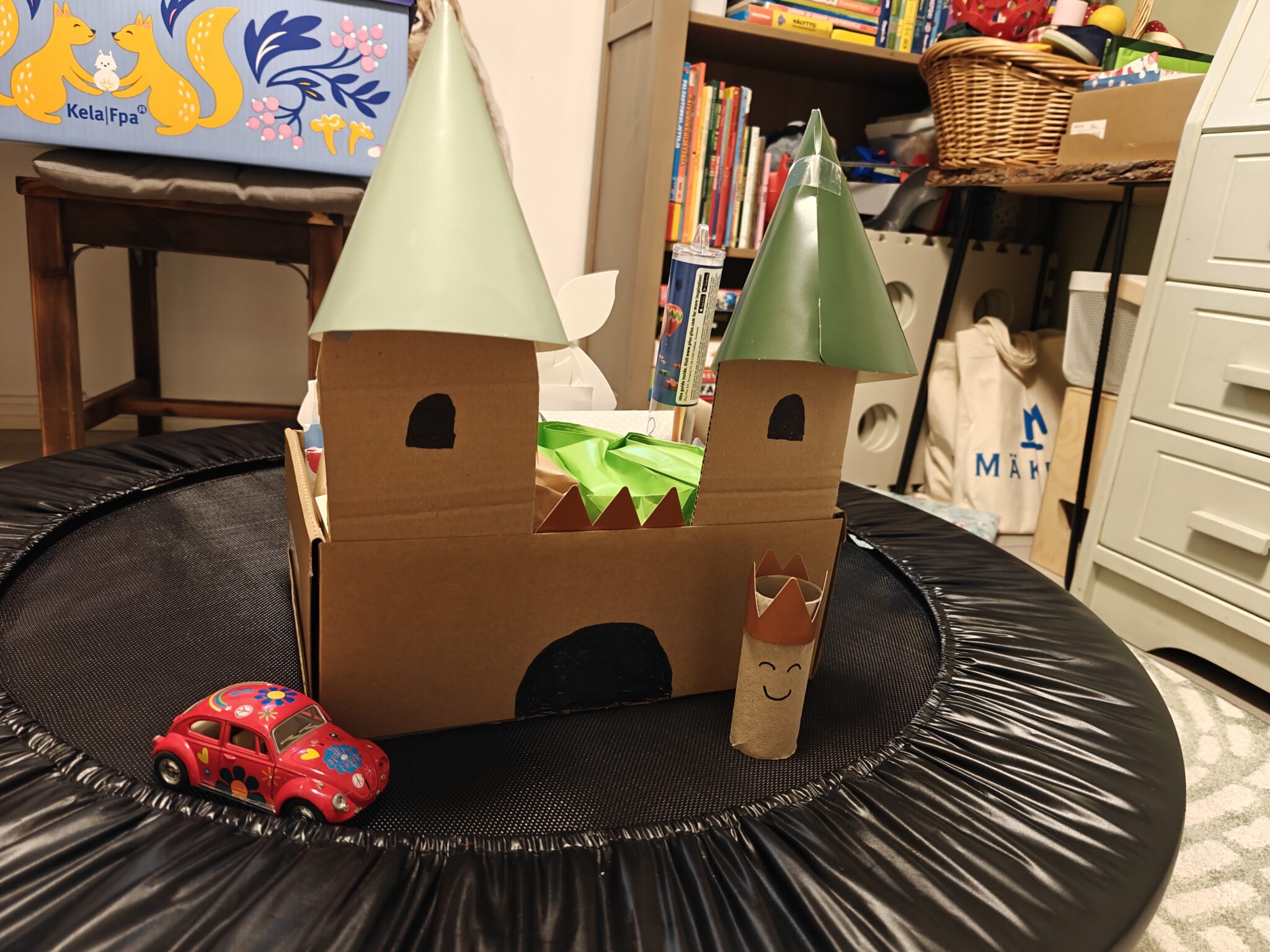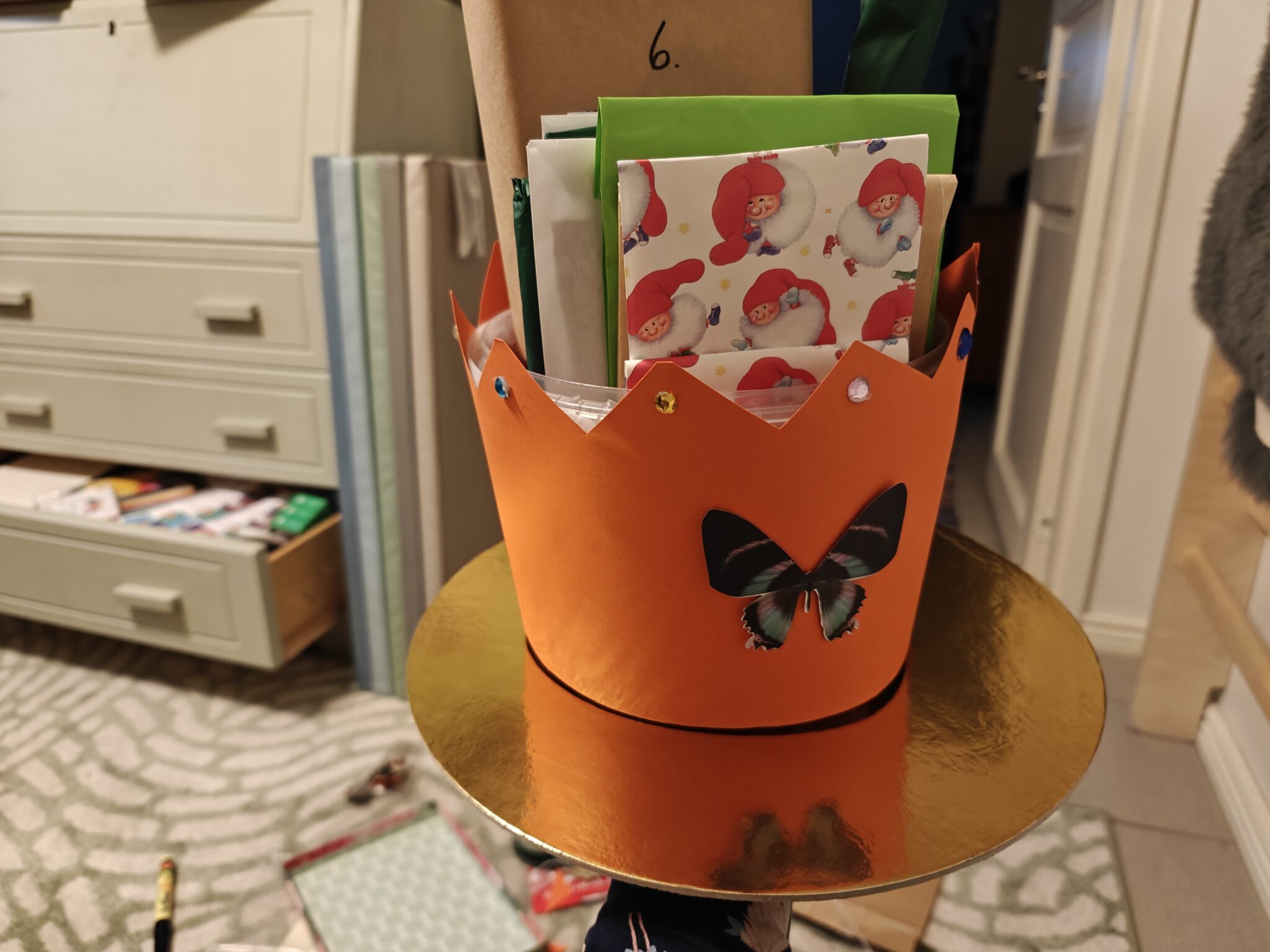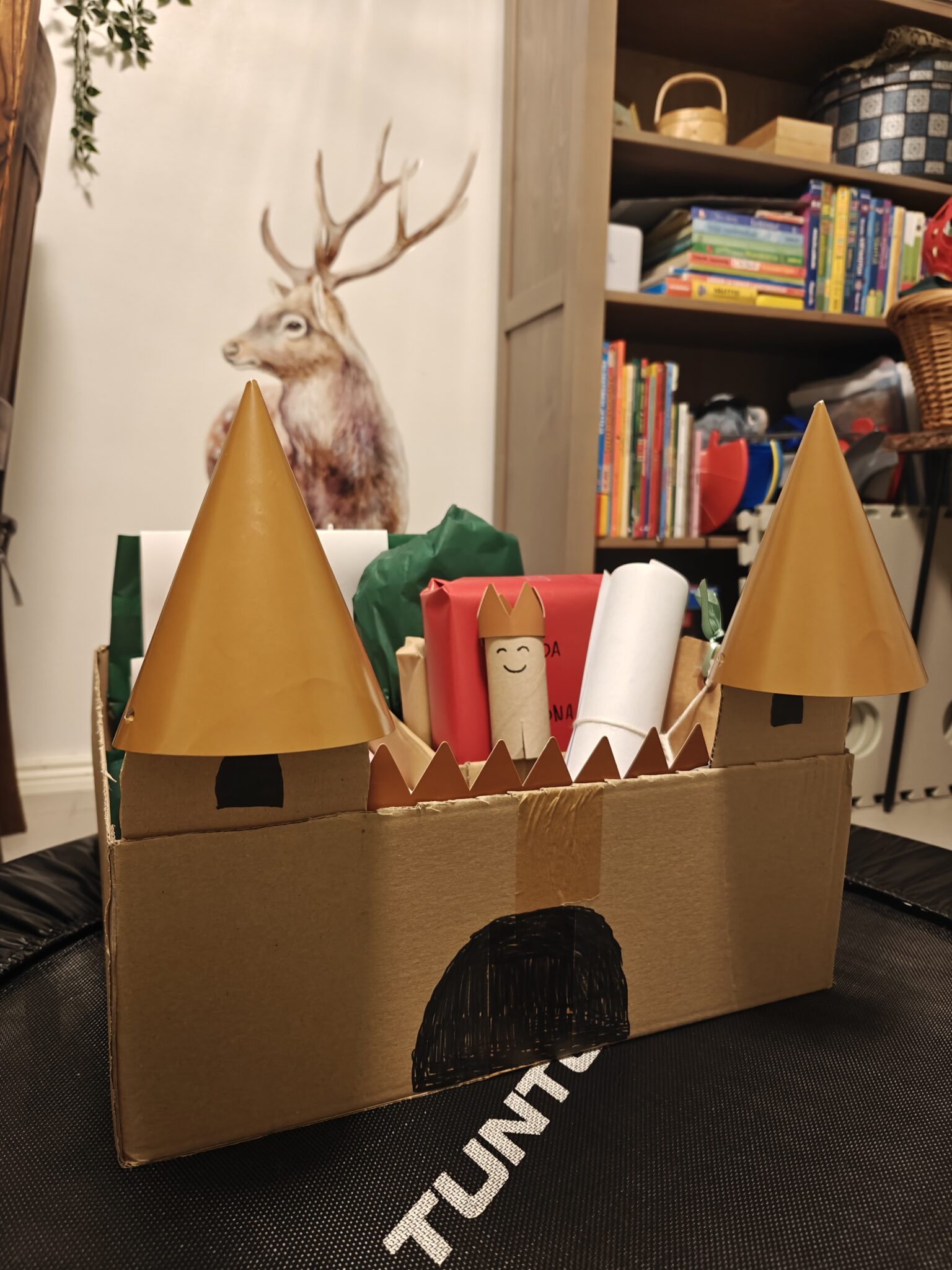 Tänä vuonna päätin hieman oikoa touhujoulukalentereiden ulkoisessa toteutuksessa. Aiemmin olen räätälöinyt kullekin kummilapselle täysin omannäköisen kalenterin hänen toivomallaan idealla. Tällä kertaa tein kalenterit kahdella teemalla saajien mielenkiinnonkohteiden mukaan: osa sai kruunua muistuttavan kalenterin, osa taas linnan. Kalentereiden tekemisessä ja luukkujen pakkaamisessa pyrin aina käyttämään mahdollisimman paljon kierrätysmateriaaleja.