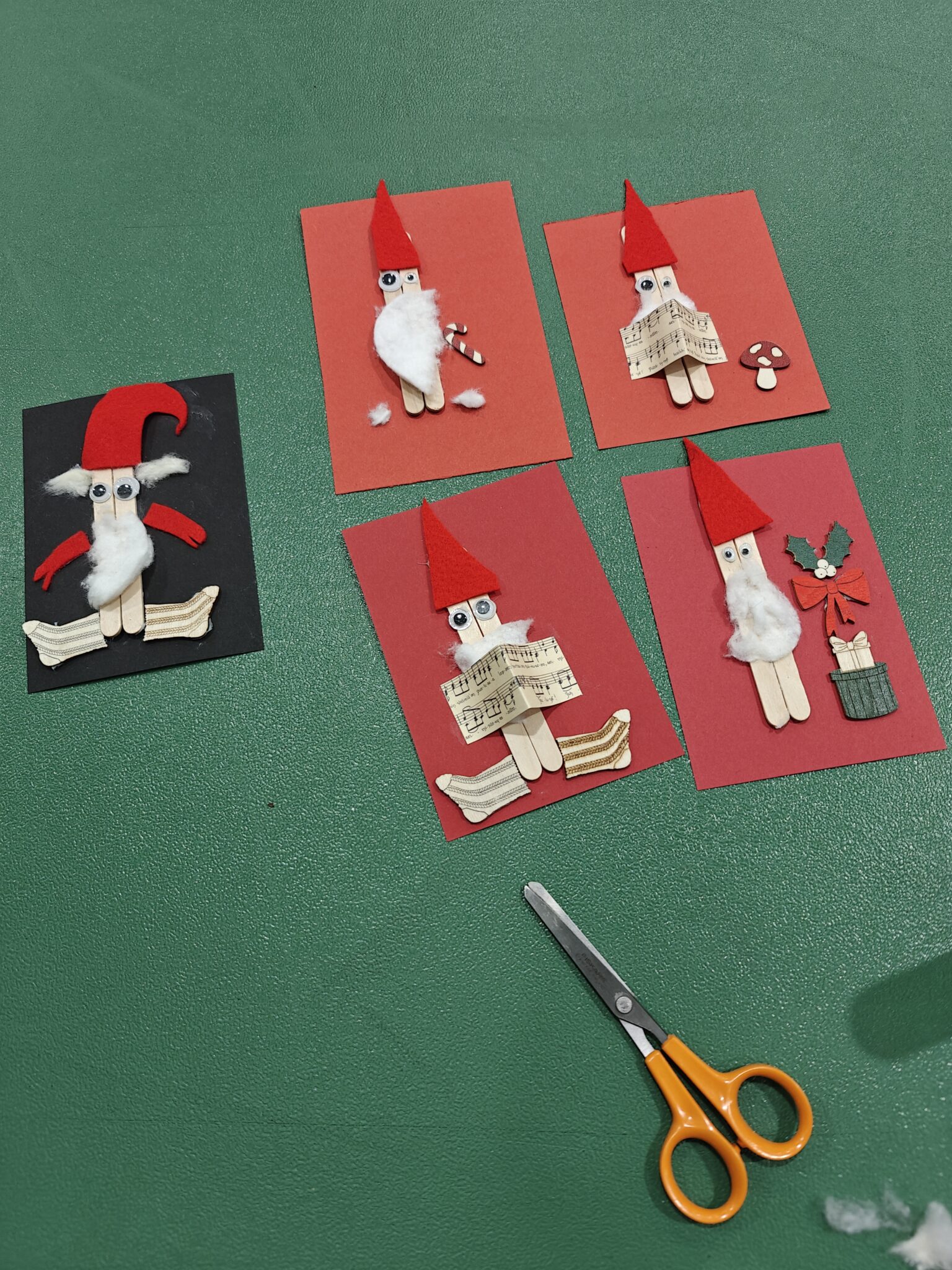 Joulukortitkin valmistimme tänä vuonna varmuuden vuoksi hyvissä ajoin. Mante kehitteli idean ja minun tehtäväkseni jäi keksiä, miten sen voi toteuttaa. Mante askarteli päiväkotiopettajiensa kortit yleisurheilukentän laidalla isoveljen treenien aikaan. Esikoisen opettajien kortit puolestaan valmistuivat musiikkiopiston aulassa pikkuveljen ollessa muskarissa.