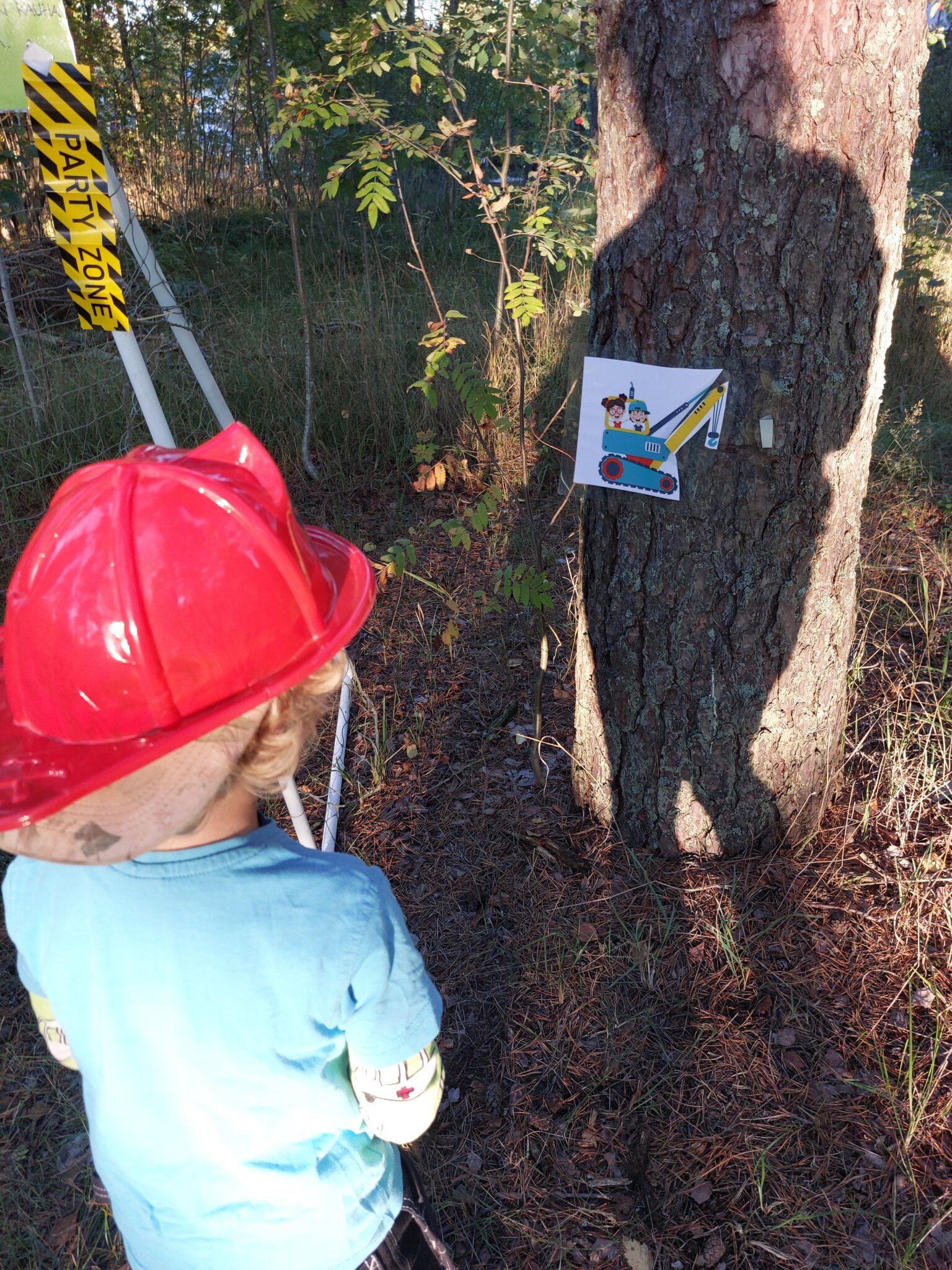 Olin kyhännyt metsään erilaisia työmaarasteja, joita lapset saivat kiertää jäätelönsyönnin ja yleisen kirmaamisen lomassa. Rasteilla pääsi siirtämään käpykuormaa kaivurilla, ajelemaan työmaarataa erilaisilla ajopeleillä, kiinnittämään kaivurin kauhaa sokkona, puhaltamaan saippuakuplia työmaatunnelin läpi ja rakentamaan majaa.