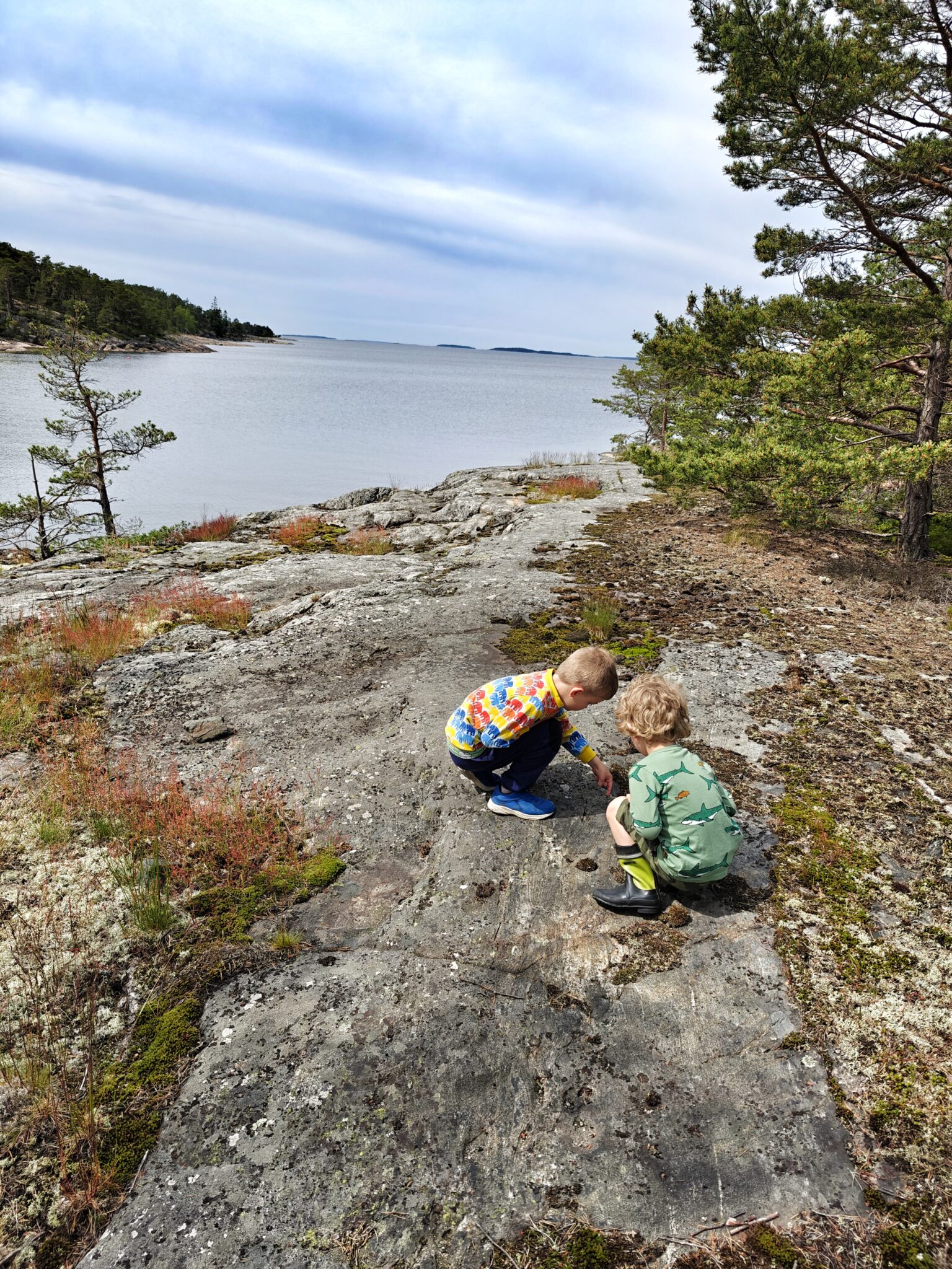 Ensimmäiset pari päivää kulutamme asettumiseen. Joku voisi kutsua sitä lorvimiseksikin, mutta se on onneksi lomalla sallittua. Lapset askaroivat rantakallioille puroja ja taiteilevat niiden pintaan katuliitumaalauksia. Kiipeilemme puihin, rakennamme palapelejä ja maalaamme kiviä – viimeistä Mante on odottanut malttamattomana läpi pitkän talven. Välillä pesemme perunat ja kannamme saunavedet kaivolta, sitten jatkamme maailman ihmettelyä. Illalla luemme aivan liian monta iltasatua ja valvomme aivan liian myöhään. Toisena mökkiaamuna molemmat lapset nukkuvat yhdeksään. Se on perheemme tähänastinen nukkumaennätys!