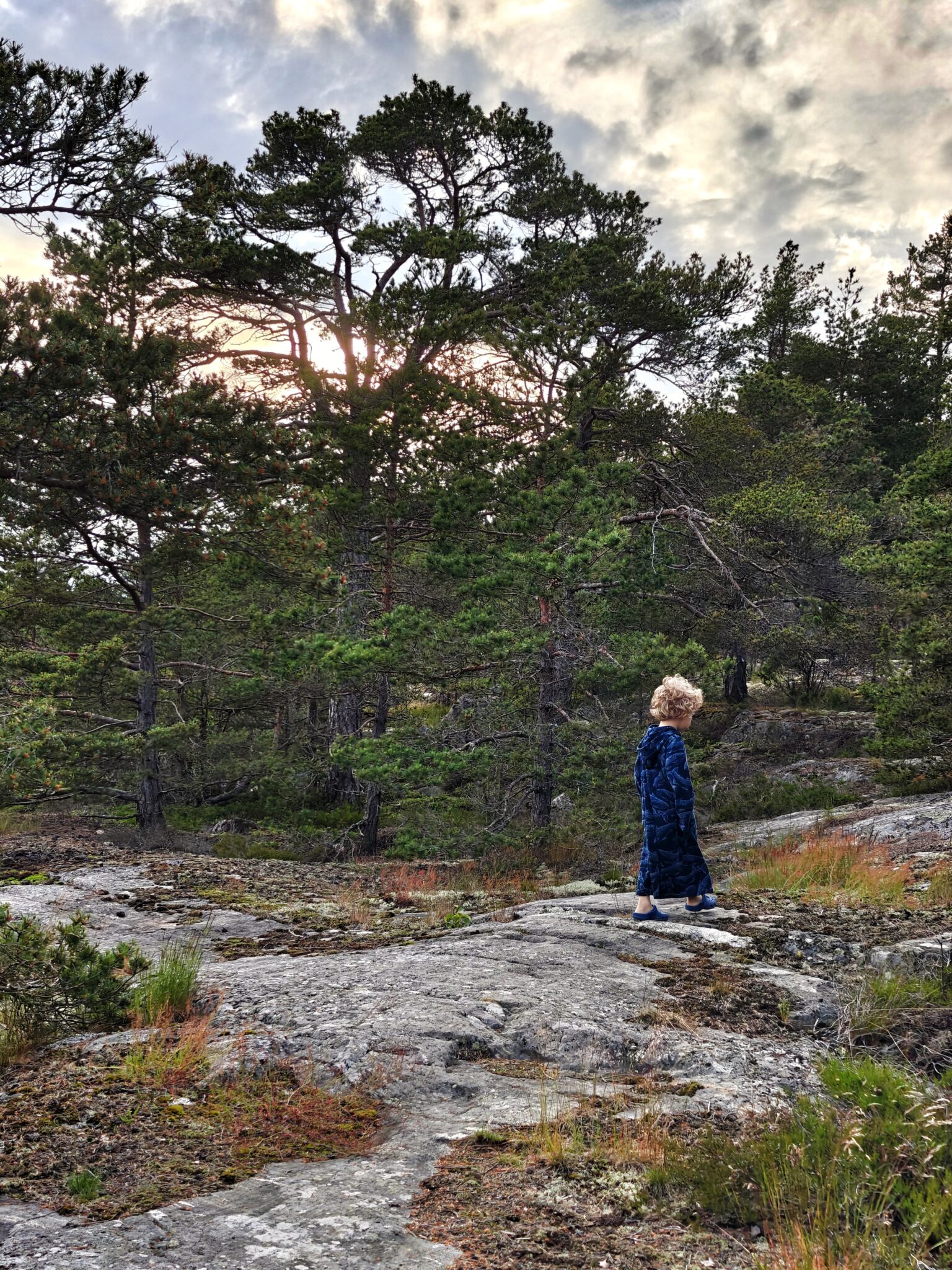 Pari päivää lorvittuamme kaipaamme tekemistä. Siispä soudamme naapurisaareen retkelle. Lapset saavat päättää, kuljemmeko lyhyemmän reitin laavulle, jolla on tarkoitus paistaa makkaraa ja syödä lounaseväät, vai menemmekö kiertoteitä kiipeilypuumetsän ja jännittävän kalliorannan halki. Lapset valitsevat seikkailun, vaikka se tarkoittaakin reilun viiden kilometrin kulkemista välillä melko hankalassakin maastossa. Jopa nelivuotiaamme kuitenkin suoriutuu koitoksesta kunnialla.