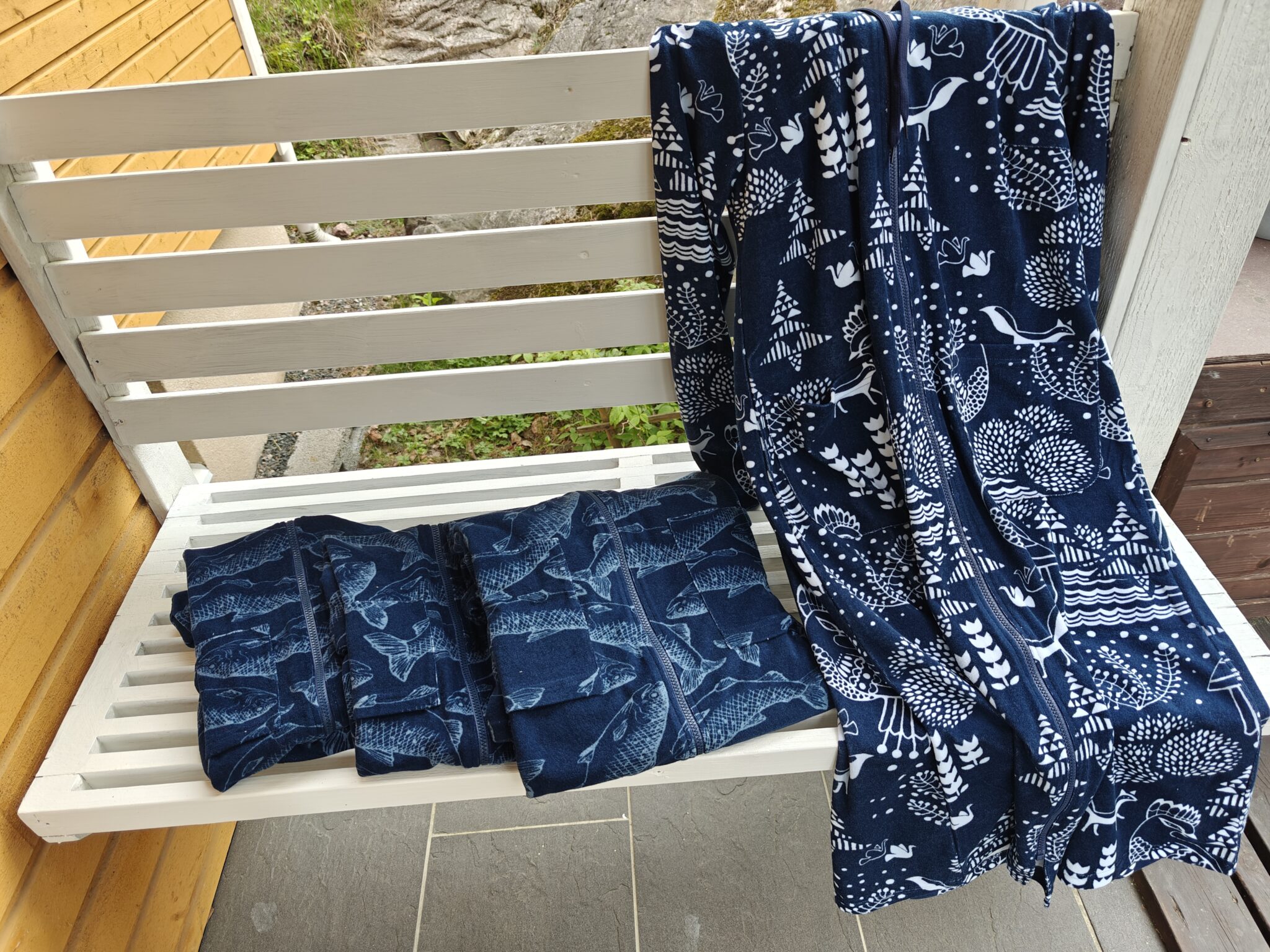 Puolison ja lasten SAUNAtakit ovat kuosia ”Lohen nappasin”, omani puolestaan ”Sielulintu”