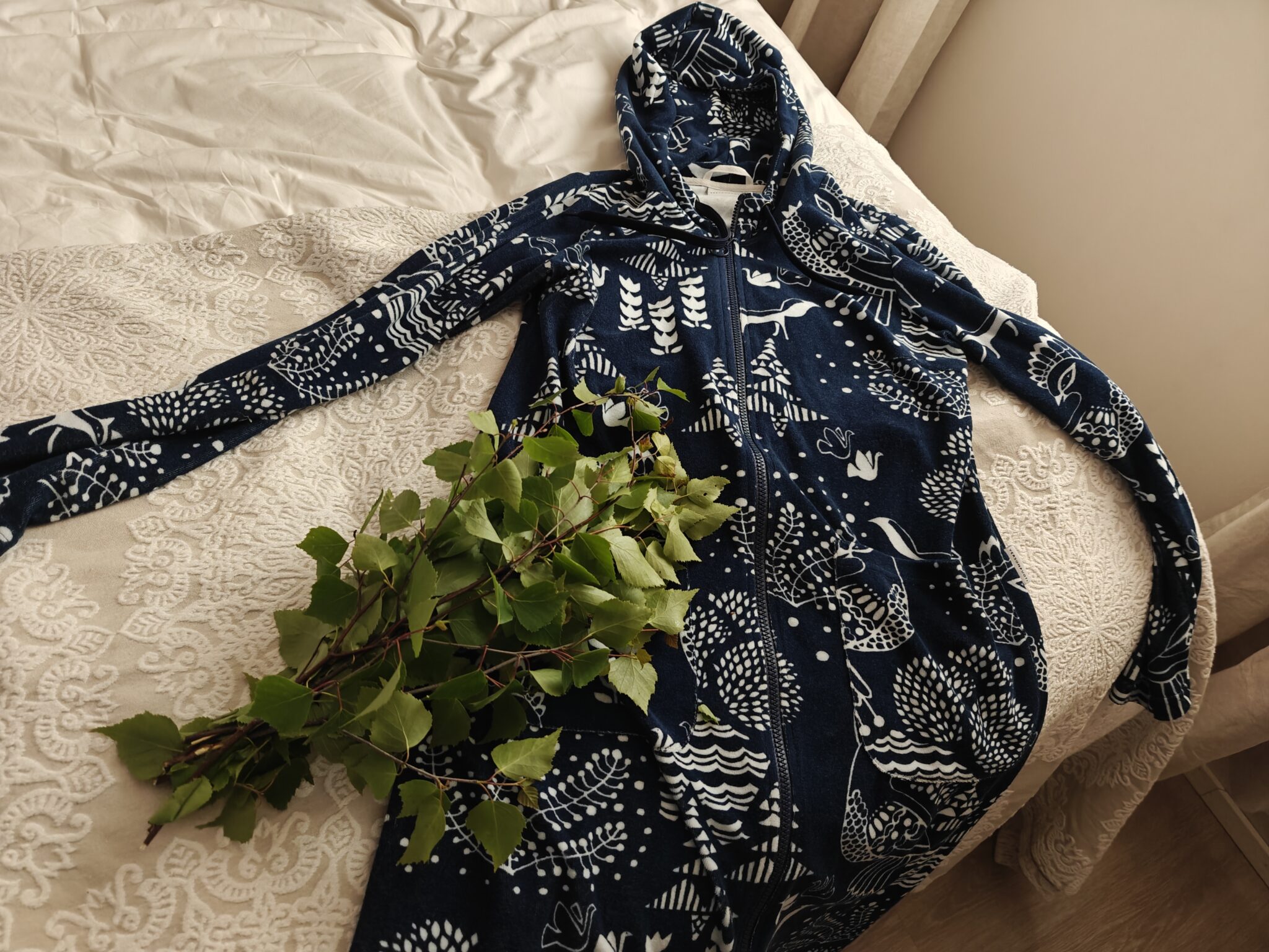 Saunalle on mökiltä hieman matkaa. Ei paljoa, mutta sen verran kuitenkin, että kun ensin on kantanut saunalle vedet ja klapikuorman ja käynyt muutamaan otteeseen lisäämässä puita kiukaan alle, tuntee löylyt ansainneensa. Etenkin alkukesän kirpeydessä ja ensimmäisten syystuulten puhallellessa saunan jälkeen on kaivannut vaatetta, johon käpertyä – jotain lämmittävää ja suojaavaa, jonka voisi vetää yöpuvun ylle. Myös hyttyset ovat kesäisin etenkin lasten kiusana. Ne tuntuvat pitävän erityisesti löylynlämpimästä ihosta. Lasten uiskennellessa mökkirannassa olen myös monesti miettinyt, miten kätevä olisi vaate, jonka voisi vain kietaista lapsen ympärille, kun tämä lopulta huulet sinisinä suostuu nousemaan ylös vedestä ja huomaakin olevansa kylmissään. Olemme kokeilleet kylpytakkeja ja ponchopyyhkeitä, mutta ne vain eivät tunnu pysyvän lastemme vauhdissa yllä.