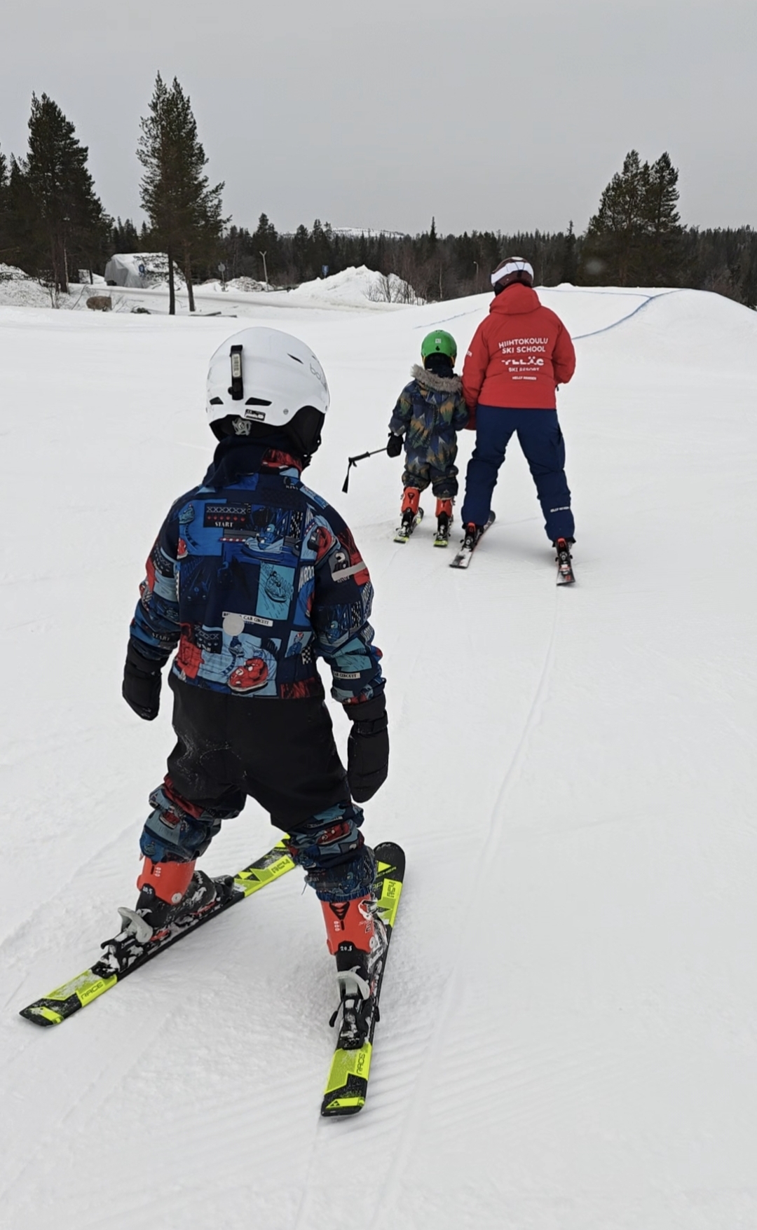 Äidin kanssa tehtyjen alkulämmittelyjen jälkeen tapasimme hiihtokouluopettajamme Päivin. Päivin johdolla kertasimme vielä jarruttamisen, kääntymisen taikanappeja painamalla sekä painonvaihtamisen käännöksissä. ”Alamäenpuoleiselle sukselle enemmän painoa, toisen suksen voi nostaa vaikka ilmaan”, Päivi muistutteli käännöksissä. Sitten olikin jo aika kokeilla, miten pärjäisimme Perherinteessä. Päivi laski kuopuksemme Manten (4v) kanssa ja minä esikoisemme (6v) kera. Ensimmäisellä laskulla otimme avuksi yhden sauvan, joka asetettiin poikittain aikuisen ja lapsen väliin niin että kumpikin saattoi pitää kiinni sauvan toisesta päästä. Näin lasten laskuvauhtia pystyi säätelemään, jolloin käännöksiin keskittyminen oli helpompaa.