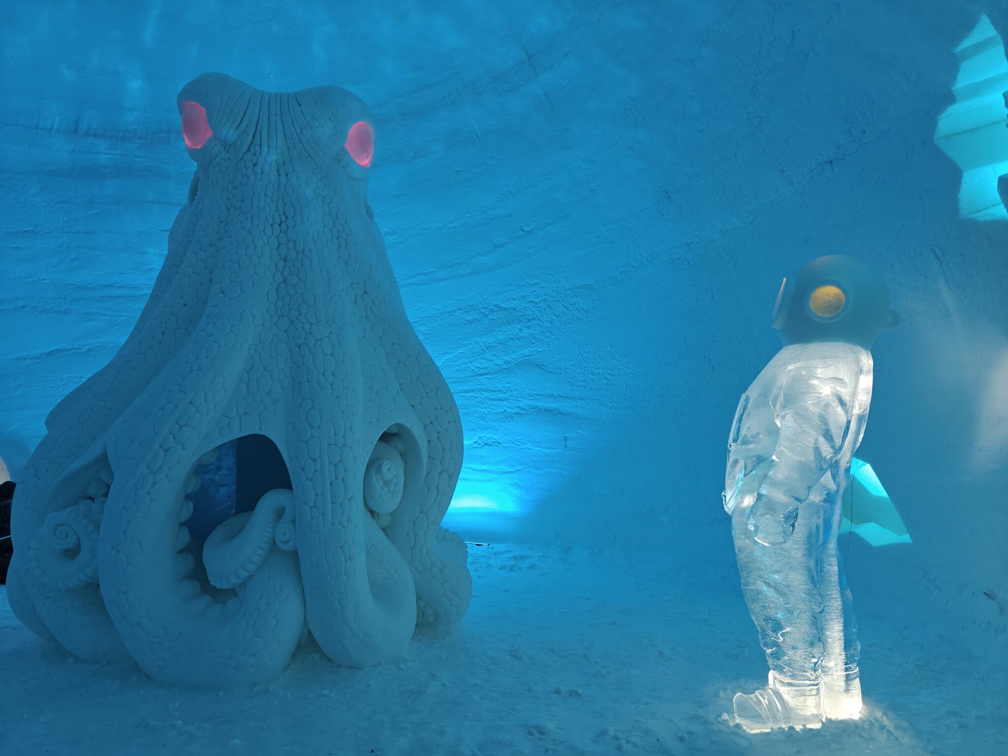 Koska laskettelupäivä oli ollut mukavalla tavalla rankka ja jännityksentäyteinen, hiihdimme seuraavana päivänä lasten kanssa vain leppoisan verryttelylenkin. Iltapäivälle lupasin yllätysohjelmanumeron. Huristelimme puolen tunnin ajomatkan Kittilän Lainioon, jossa yllätys odotti: SnowVillage oli valtavista jääigluista koostuva kokonaisuus täynnä lumesta ja jäästä veistettyä taidetta. Iglujen sisään rakentui kokonainen taikamaailma, jossa seikkailtiin tämän vuoden teeman mukaisesti veden alla. Yhdessä huoneessa ympärillämme uiskenteli parvi laulavia valaita, toisessa merihevosten joukko. Vaikutuksen teki myös lumisviitti, jonka helmisimpukkasänkyä ympäröivät valtavan mustekalan lonkerot. Lasten suosikkeja olivat Poseidonin lumidisko sekä jääliukumäki (johon saatoin itsekin eksyä muutamaan otteeseen).